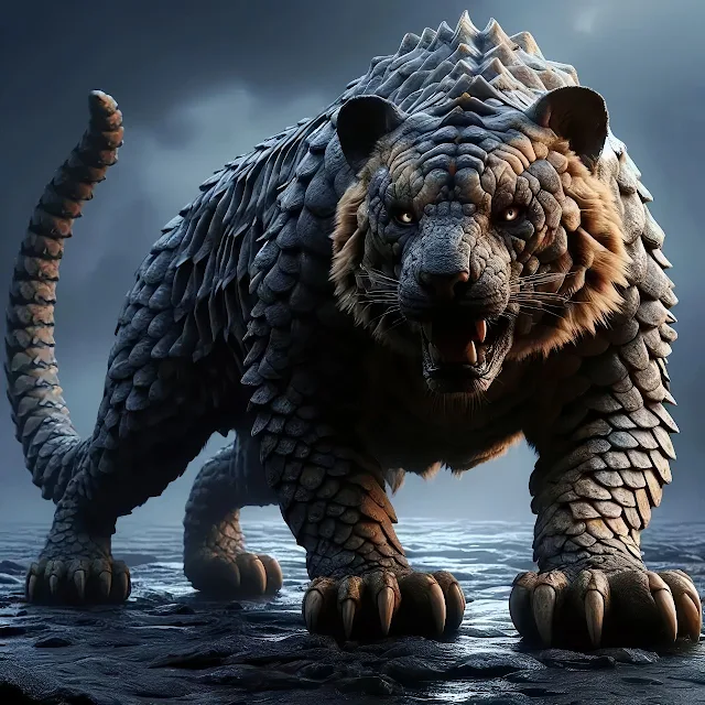 | DOWNLOAD Prompt: A fearsome, chimeric creature with the body of a tiger and the scales of a pangolin. The creature has glowing yellow eyes, sharp claws, and a menacing snarl. It stands on a rocky cliff, with a dramatic sky in the background. The overall image suggests a powerful, mythical creature, capable of immense destruction and power. |